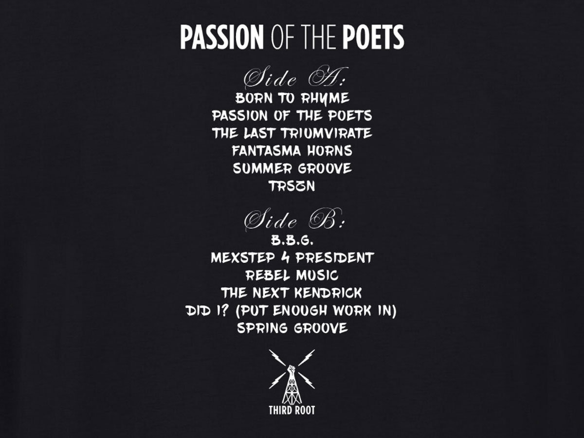 Double-sided printing with "Passion of the Poets" tracklisting adorned on the back.