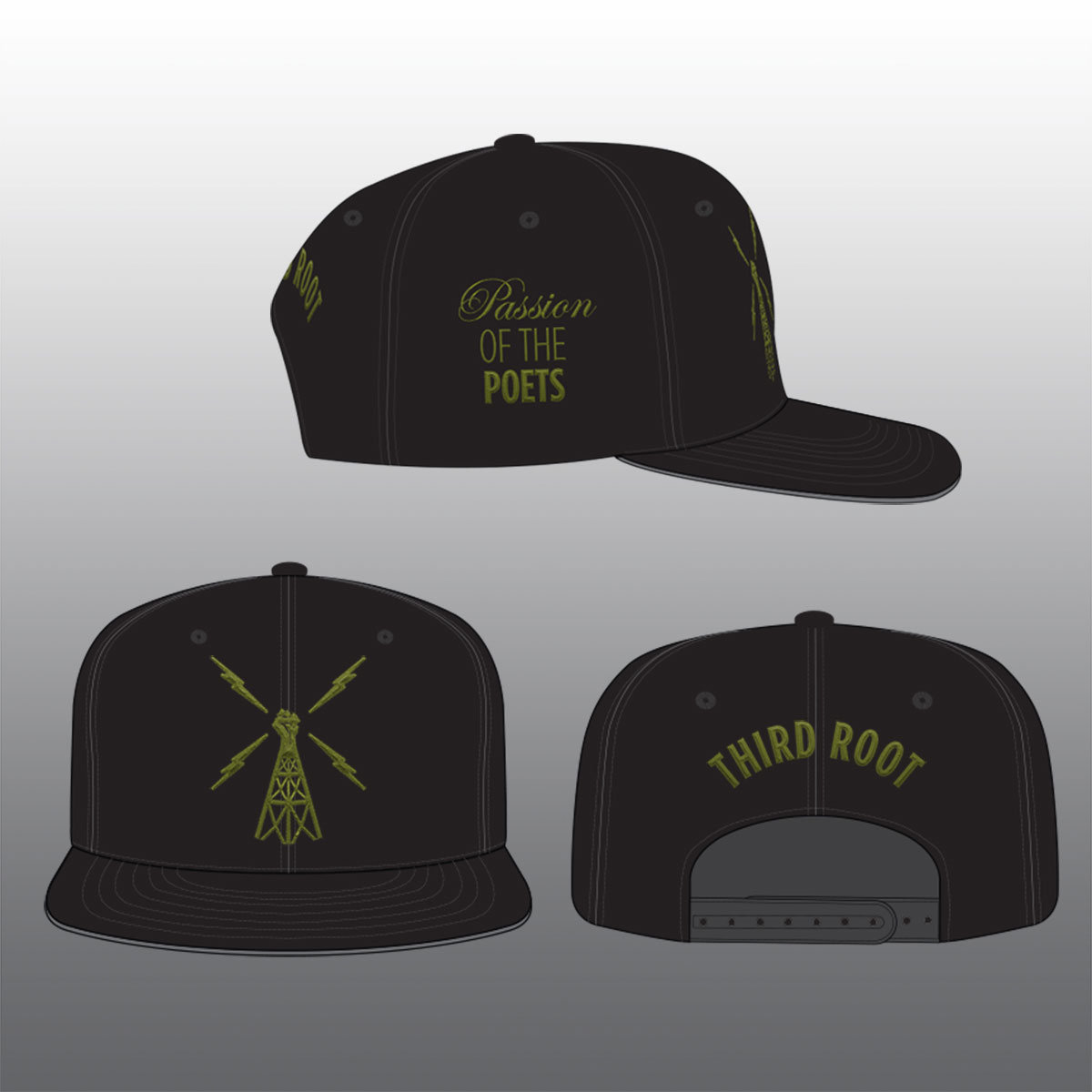 The official "Passion of the Poets" Black snapback cap. Embroidered with a unique VARIEGATED OLIVE GREEN thread on front, side and back panels. Rep your passion with style!