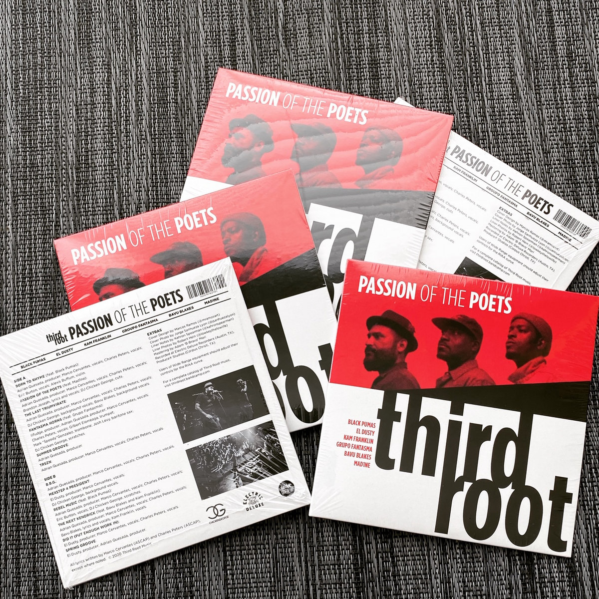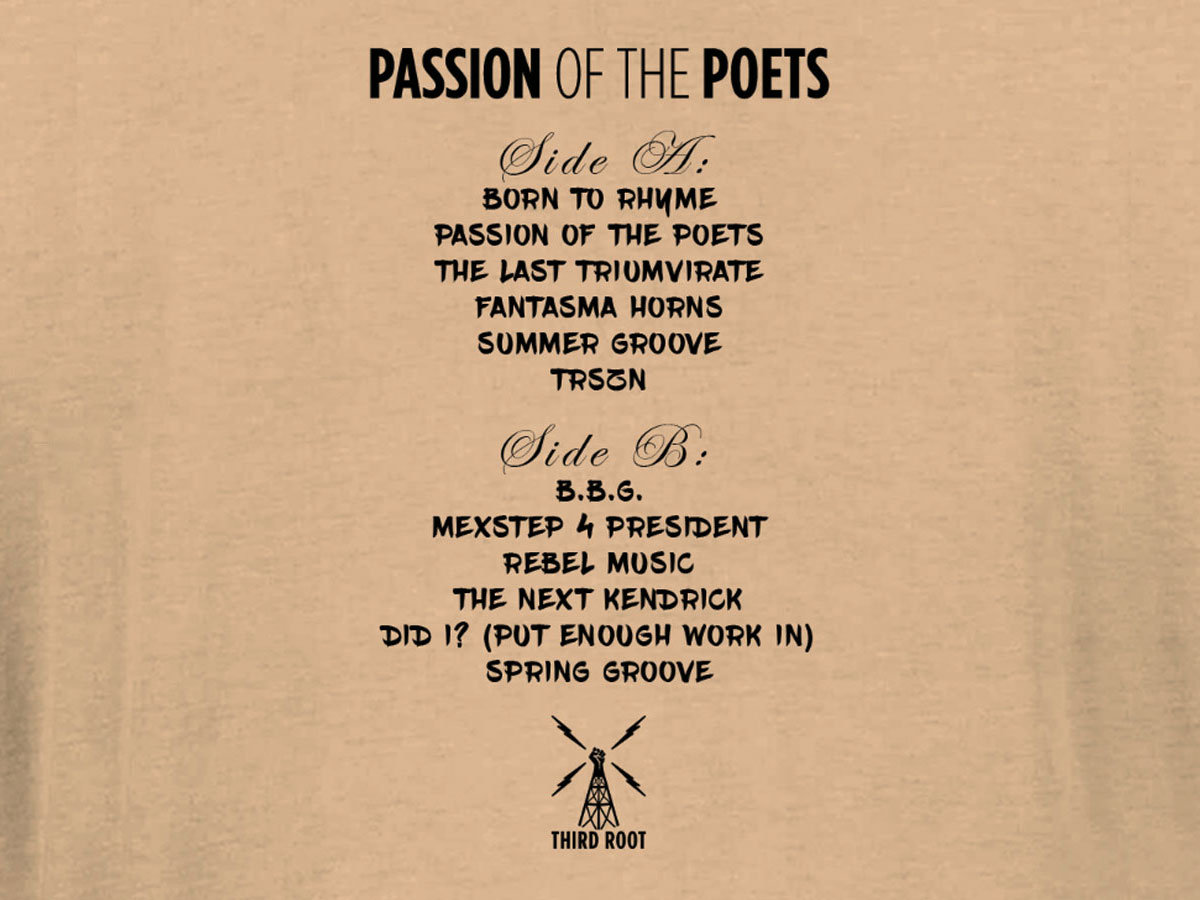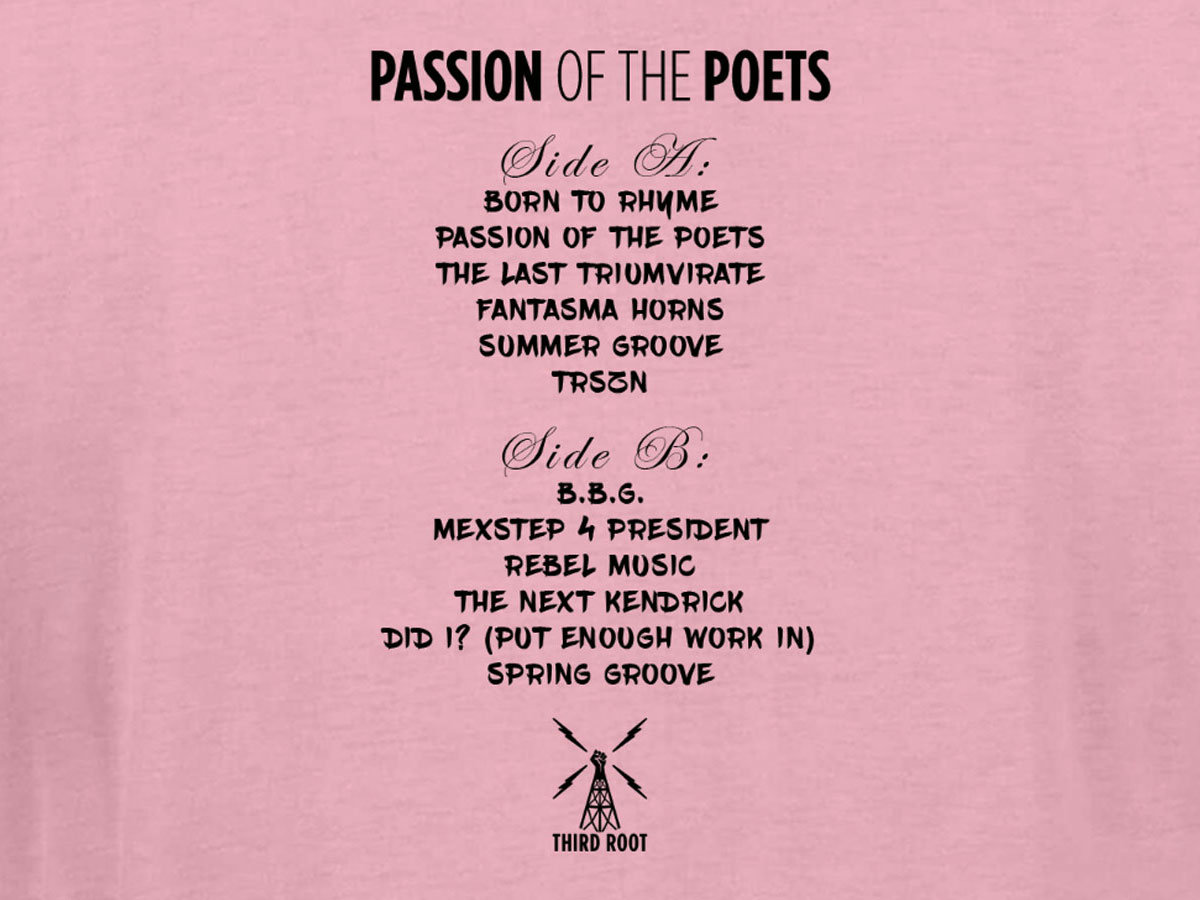 Double-sided printing with "Passion of the Poets" tracklisting adorned on the back.